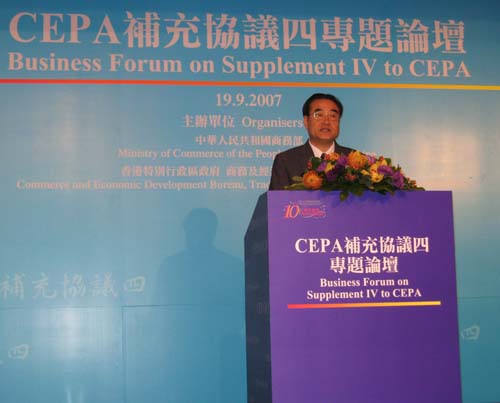 为加强对CEPA的宣传和推介,帮助香港业界更好地了解和利用CEPA,9月19日,商务部和香港特区政府在香港共同主办了“《CEPA补充协议四》专题论坛”。商务部廖晓淇副部长和香港特区政府财政司司长曾俊华出席论坛并致辞。民政部、交通部、文化部、卫生部、旅游局、港澳办、银监会、证监会、保监会、贸促会等中央部委,内地四个直辖市与泛珠三角的商务主管部门,以及香港特区政府及业界的代表共约400人参加了论坛。