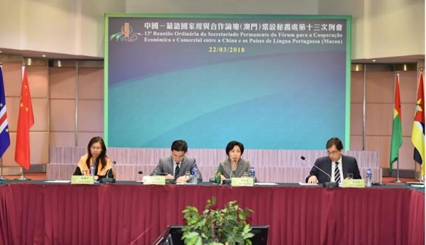 2018年3月22日,中國—葡語國家經貿合作論壇(澳門)常設秘書處第十三次例會在澳門舉行。中國商務部、中聯辦經濟部和澳門特區政府代表,以及各葡語國家駐華大使、葡語國家聯絡員和中葡論壇(澳門)常設秘書處成員等出席。會議總結了2017年工作,討論通過了2018年工作計劃,並研究了常設秘書處其他工作。